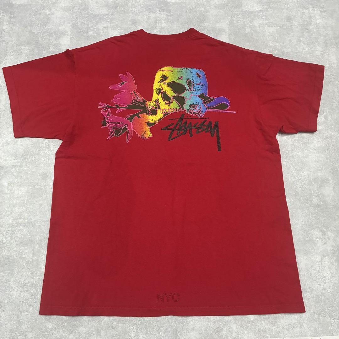 発色の良い赤のボディに映える虹色のスカルフラワーのプリントがカッコいいです。