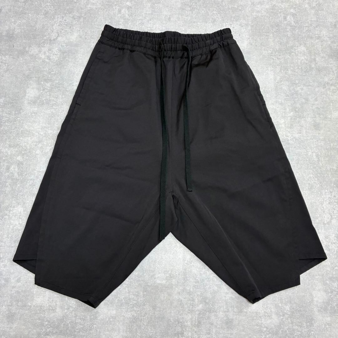 レーヨンコットンのハリと光沢のある素材感に深めのサルエルシルエットがオシャレなアイテム。