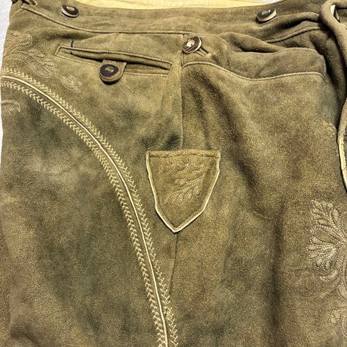 厚みのあるスウェードレザーを使用し、フロント当て布(Hosenlatz)やバック部分に植物モチーフの刺繍が施された伝統的なデザインが特徴です。
