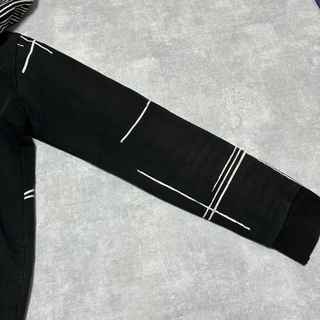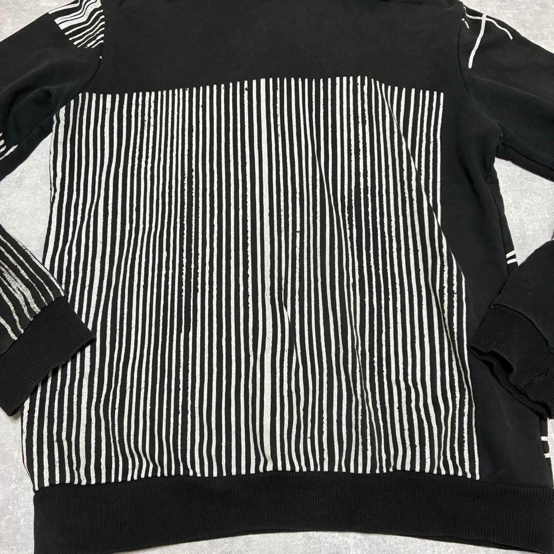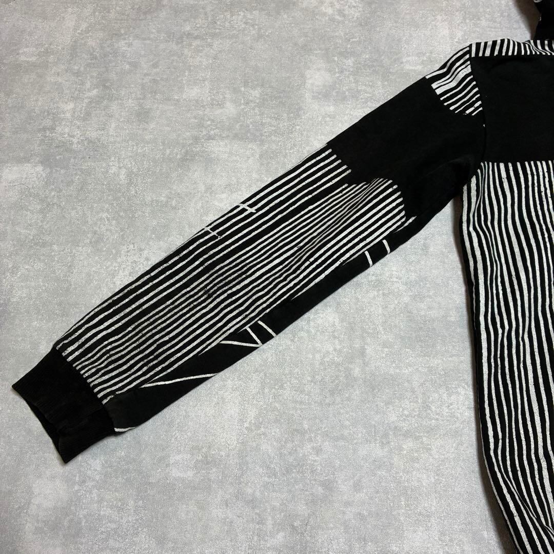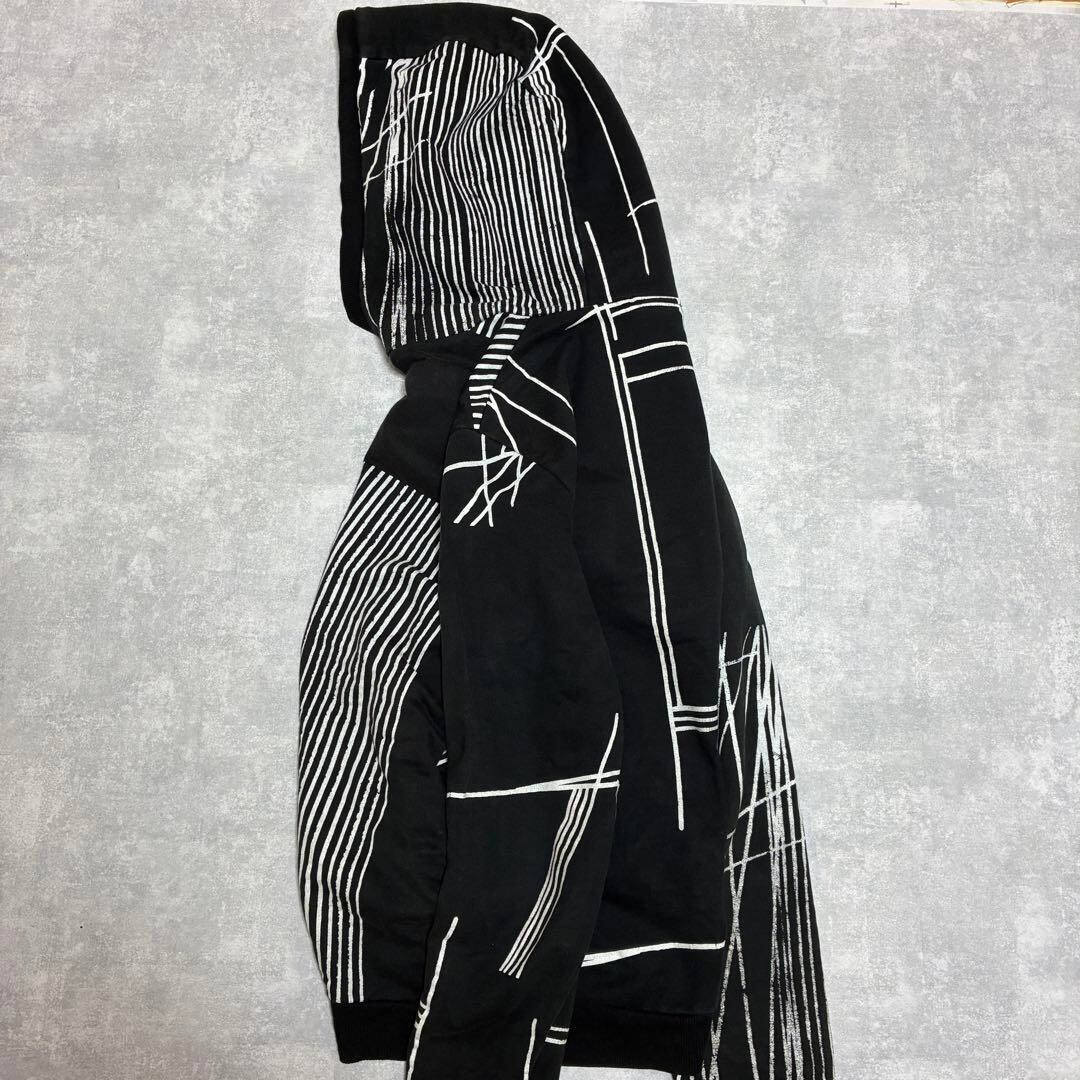 フロントには等間隔に走るストライプをベースにしたグラフィック、バックや袖にはアシンメトリーなラインパターンを配し、全体でモノトーンながら視覚的なインパクトを持たせています。