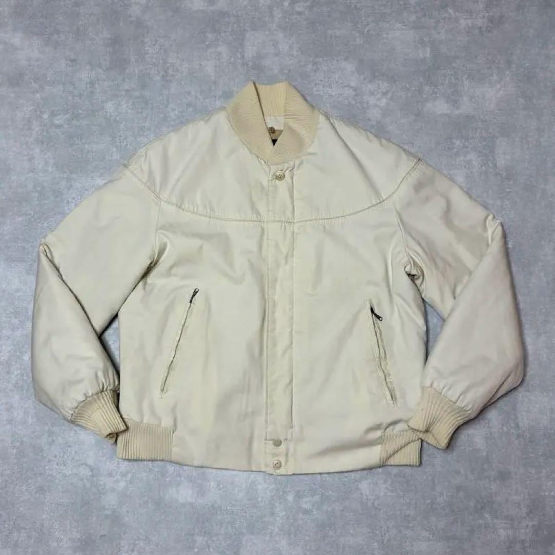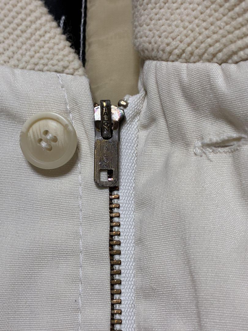 少しベージュみのあるホワイトのシェルにお馴染みカップショルダー、TALON製フロントジップ、両ポケットの涙TALON、比翼仕立て、リブ襟・袖・裾を装備。