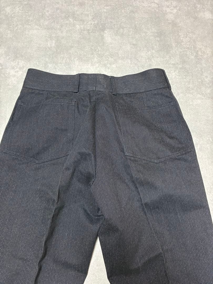 シャープなテーパードシルエットと細かなストライプ織りの生地が魅力のアイテム。