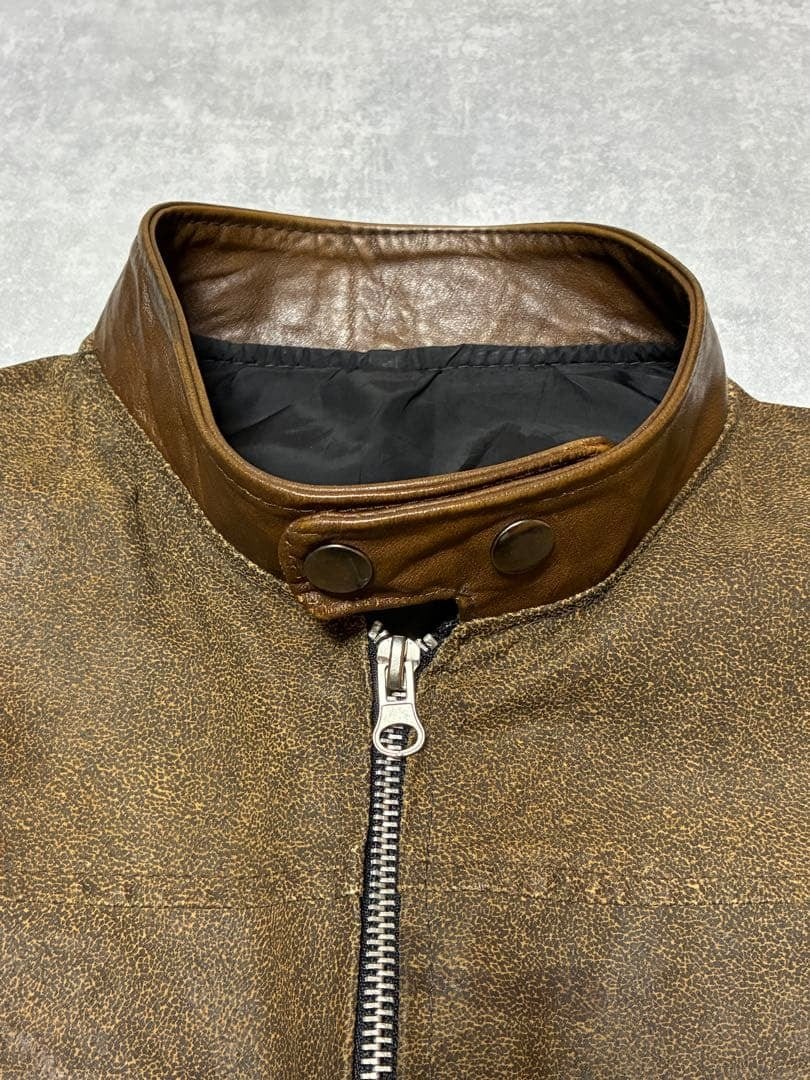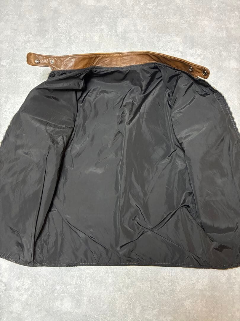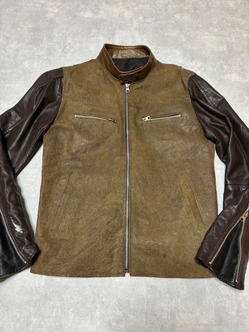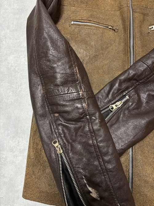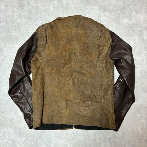 ボディにはクラックの加工が施されたくすんだブラウンのレザーを使用しており、スリーブには艶のある濃いブラウンのスムースレザーを使用、襟元はブラウンのレザーが使わています。