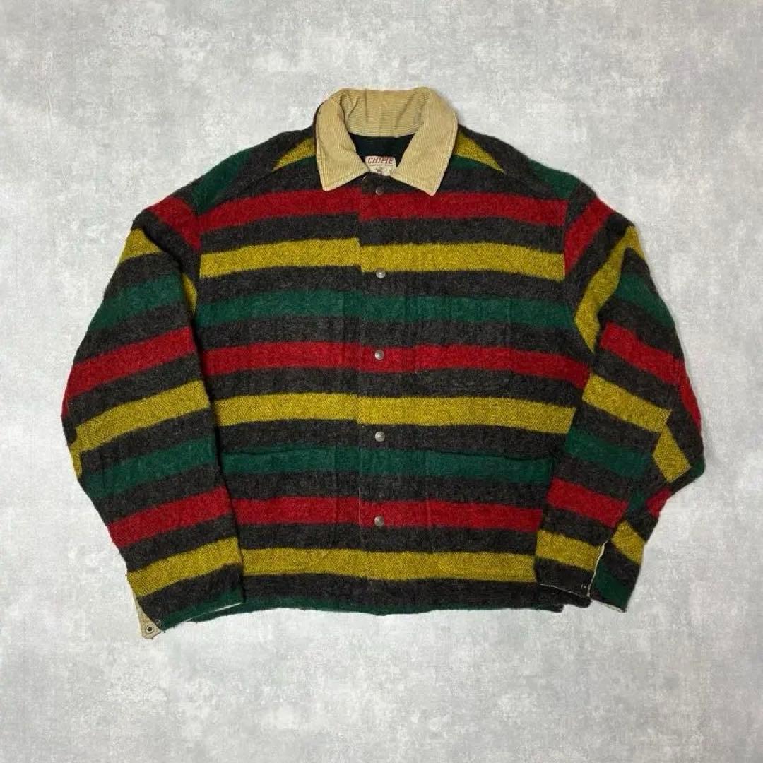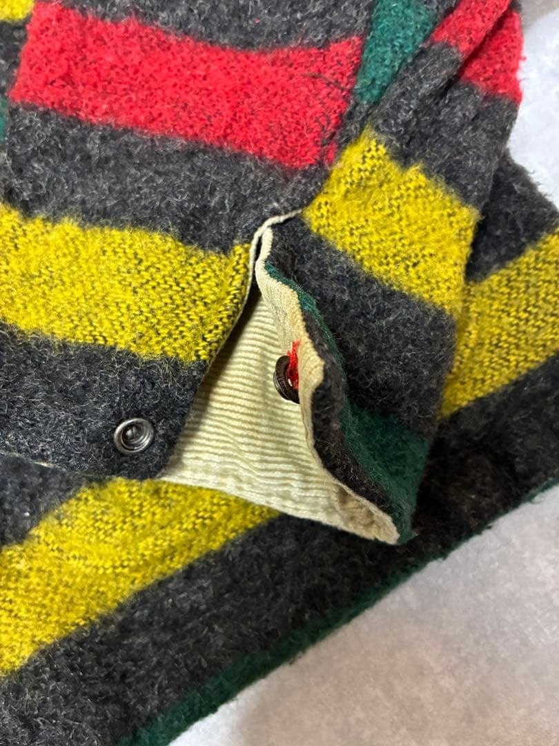 ウエスタンを意識したブランケットのジャケットにラスタカラーのボーダーの組み合わせが面白いデザインになっています。
