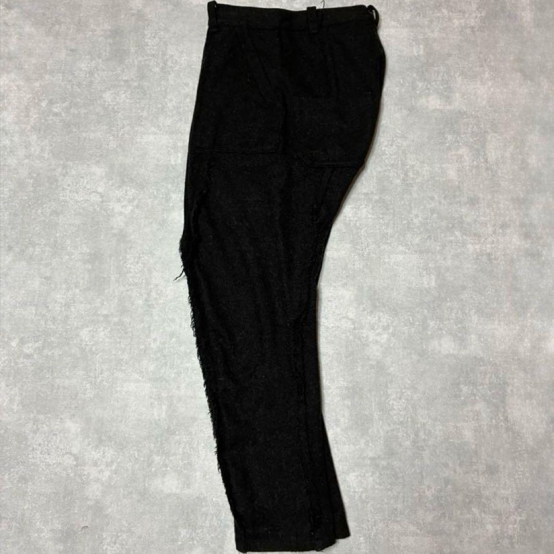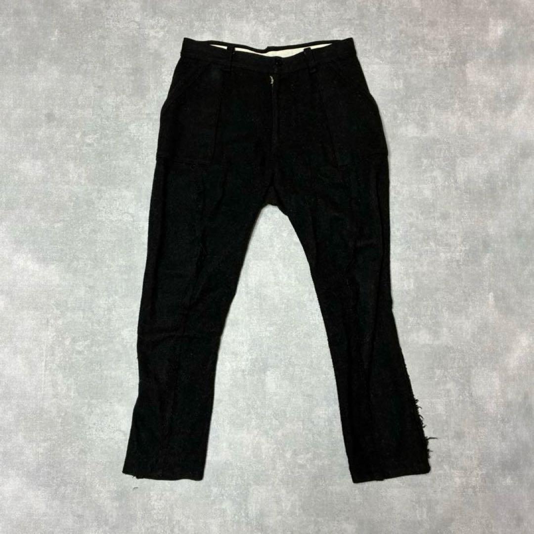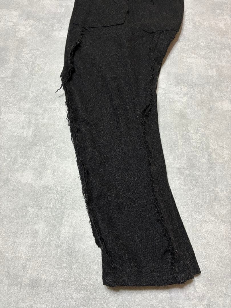 股上から腿、膝、裾へと自然に沿うよう設計された細身のシルエットになっており、やや深めのサルエルシルエットや切りっぱなしデザインも相まって独特な雰囲気に仕上がっています。