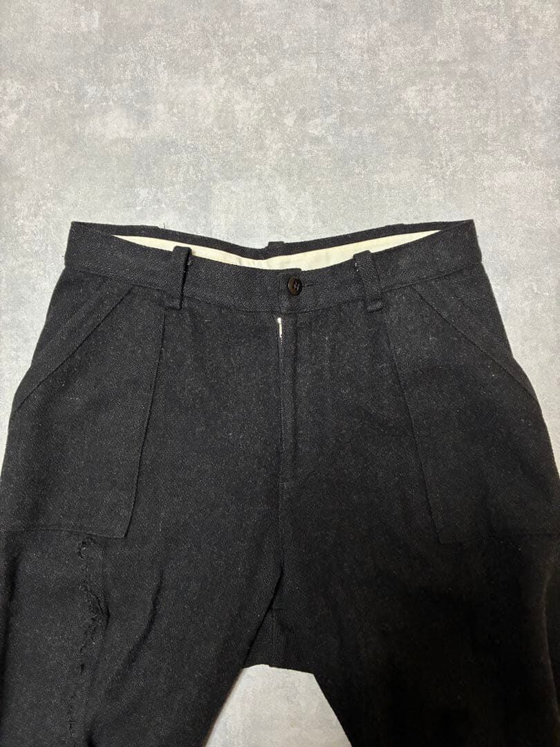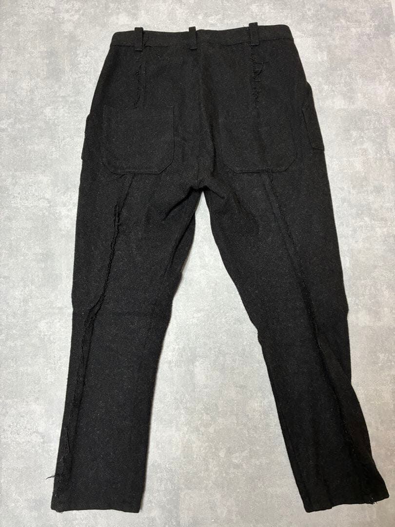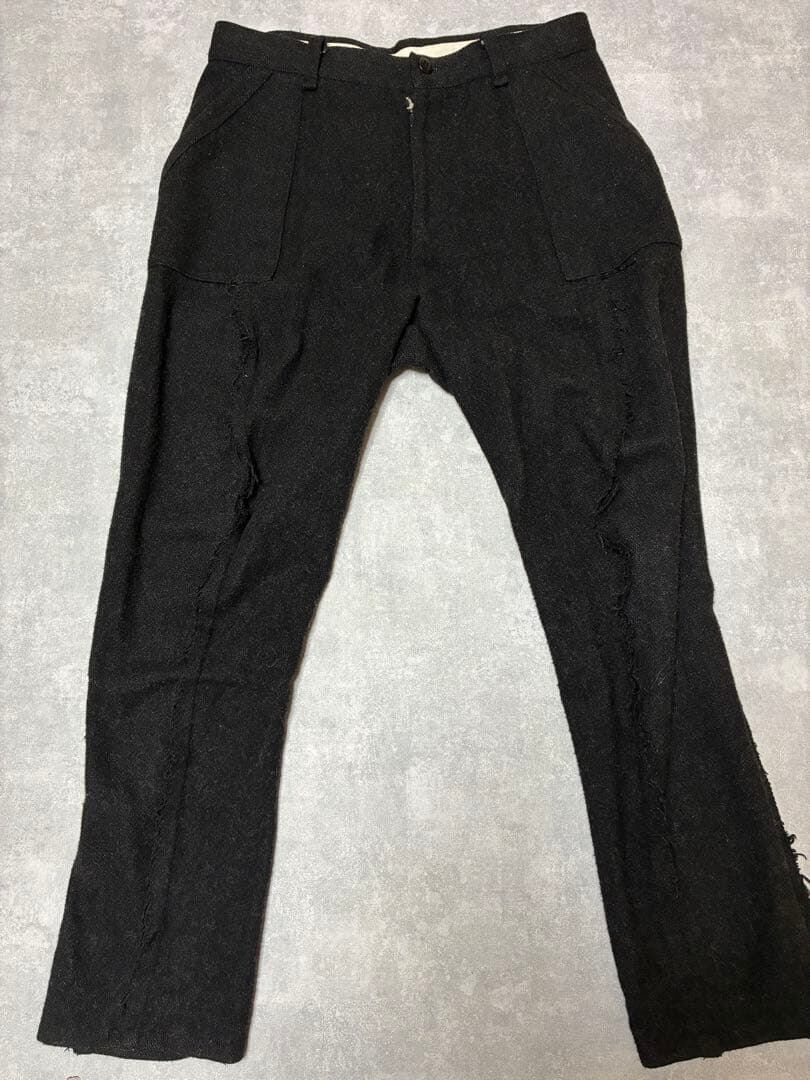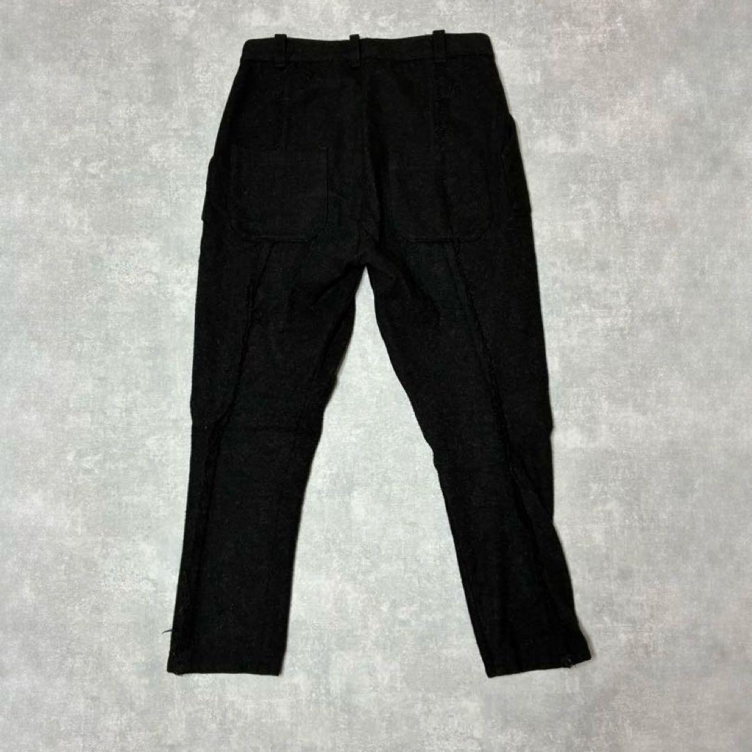 股上から腿、膝、裾へと自然に沿うよう設計された細身のシルエットになっており、やや深めのサルエルシルエットや切りっぱなしデザインも相まって独特な雰囲気に仕上がっています。