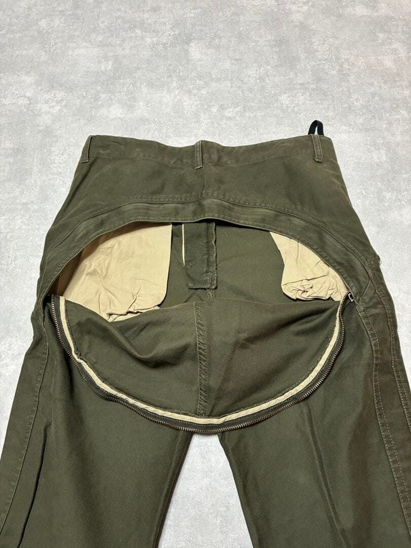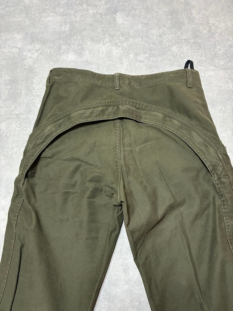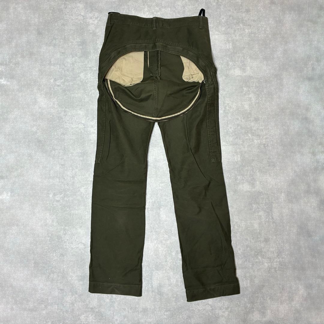 フロントは無骨なワークパンツの趣を持ちながら、背面にはブランドを象徴する“お尻のジップ”を大胆に配置。