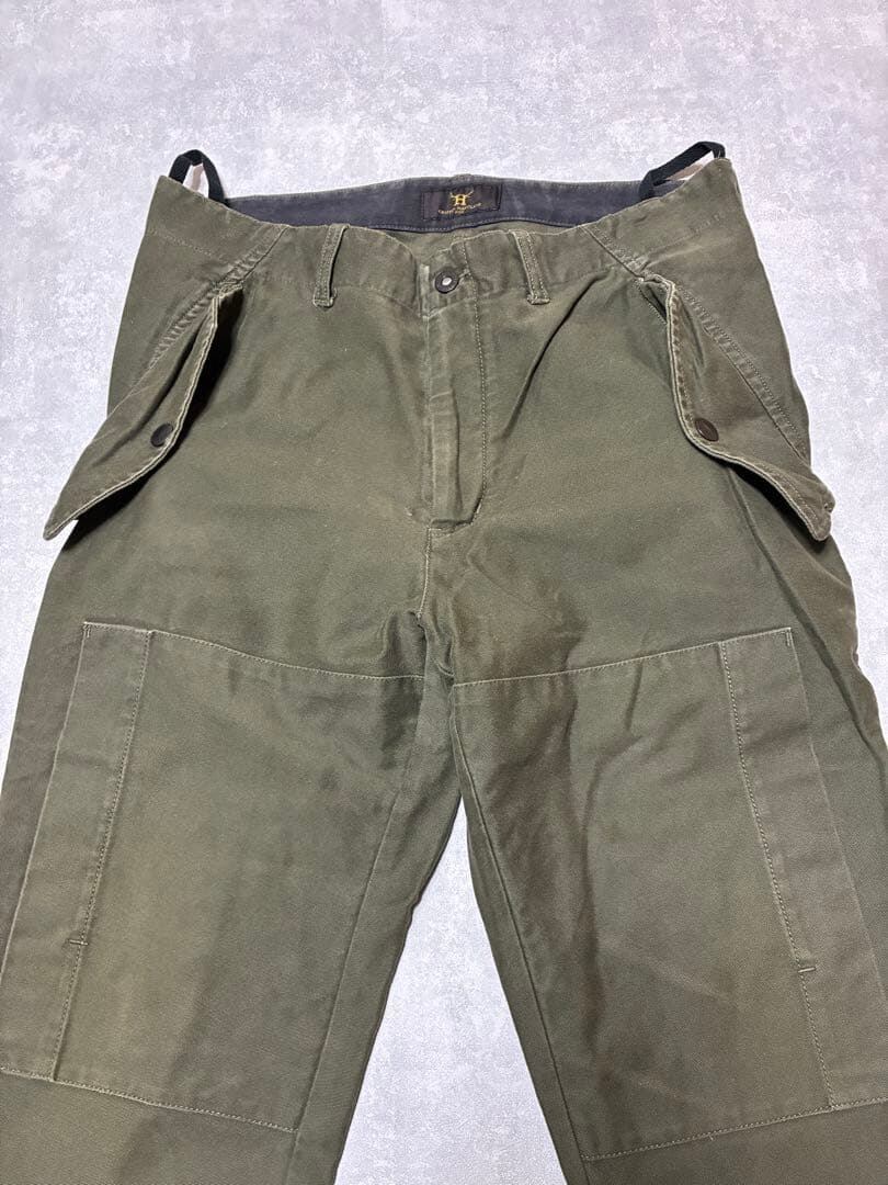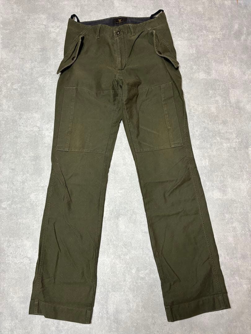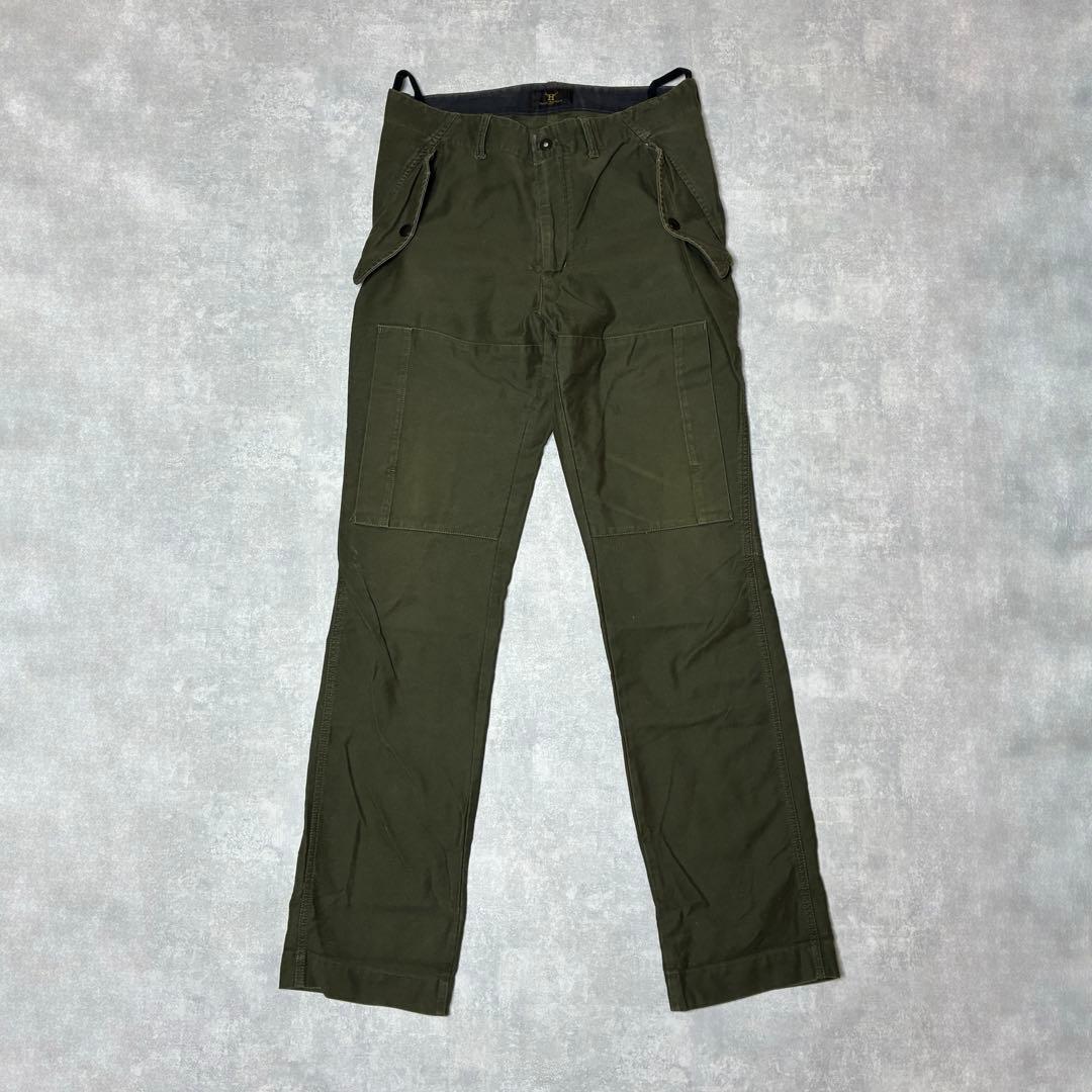 カーキベースのしっかりとしたコットン素材を採用し、フィールドパンツらしい耐久性と風合いを確保。