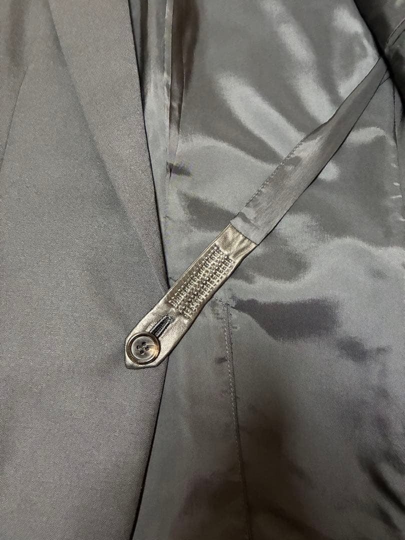 一見するとミニマルなブラックジャケットですが内側に配されたスタッズ付きレザーストラップでボタン留めする変形仕様のアイテム。