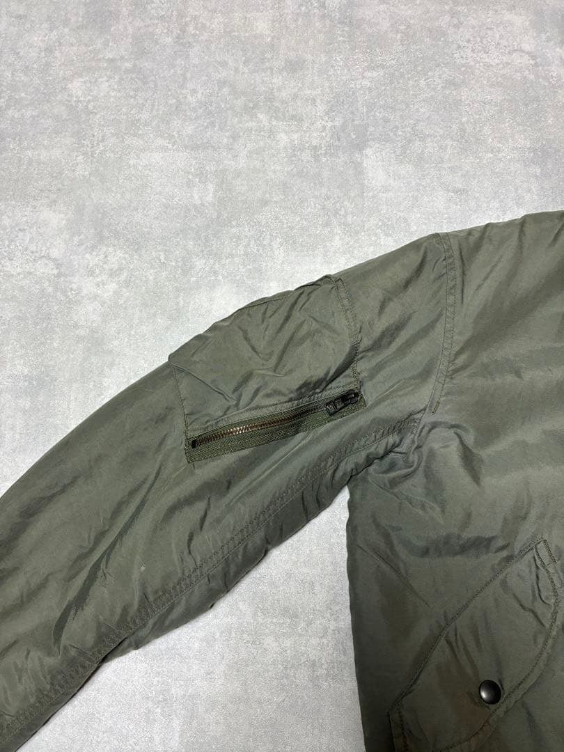 ボディはくすんだオリーブナイロン、リブはブラックの配色でミリタリーの無骨さを残しながらも都会的に着られるバランス。