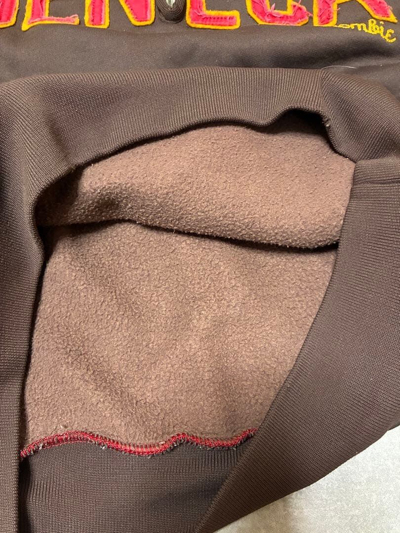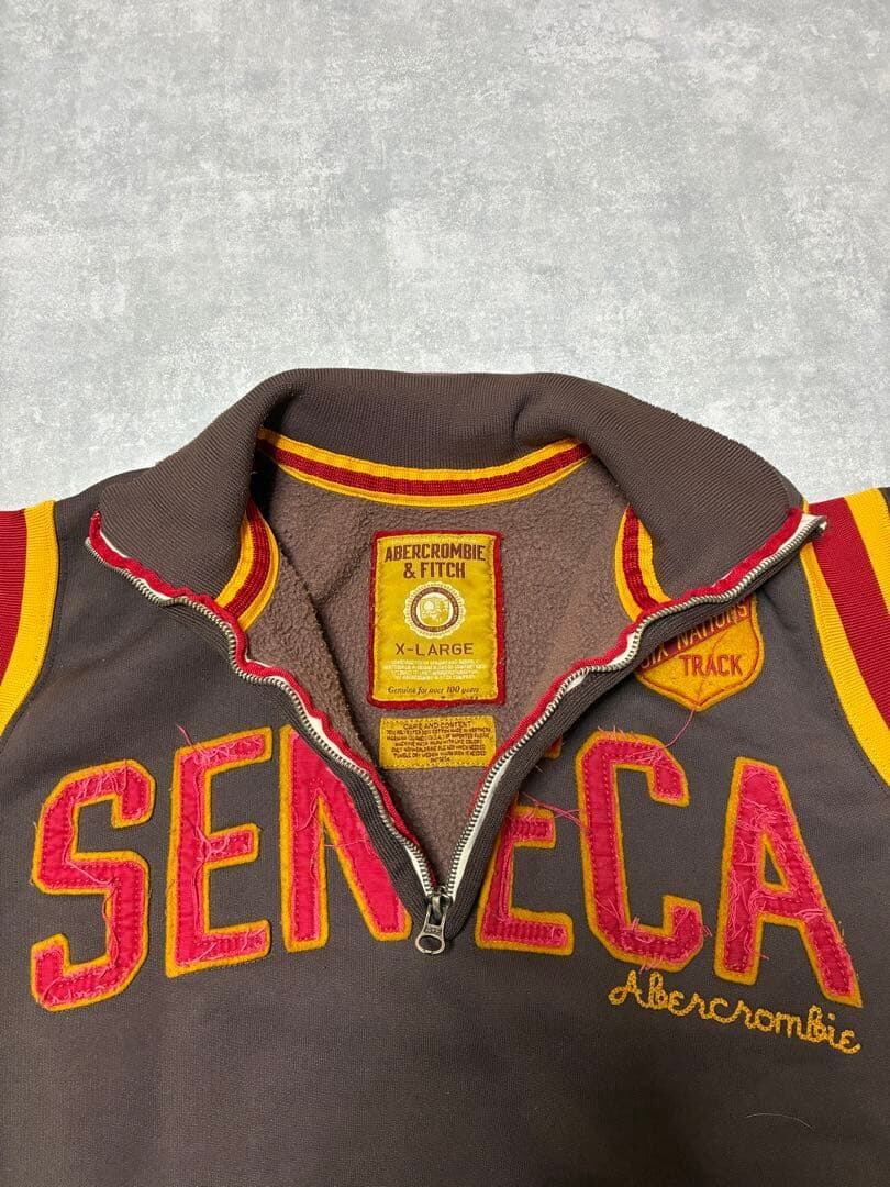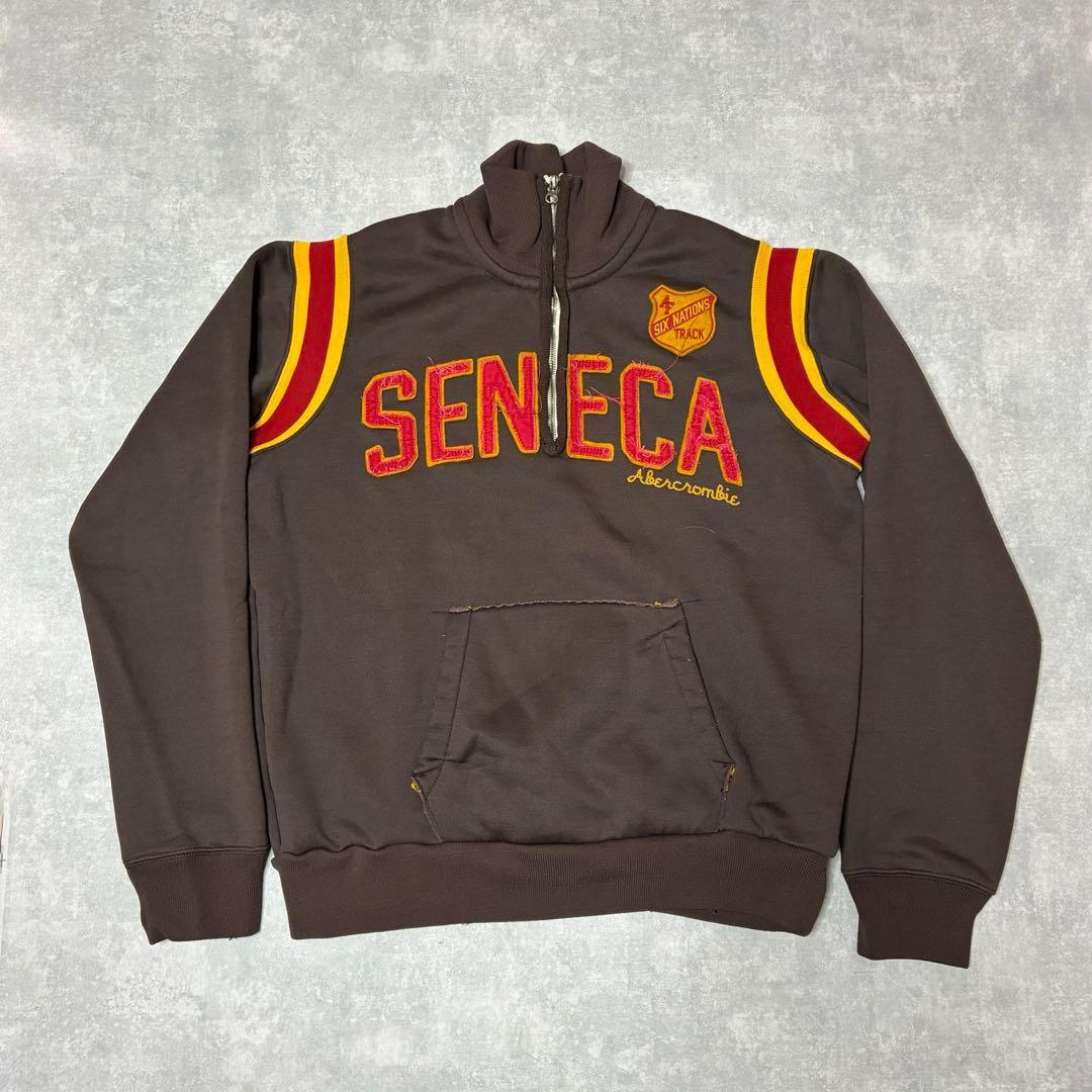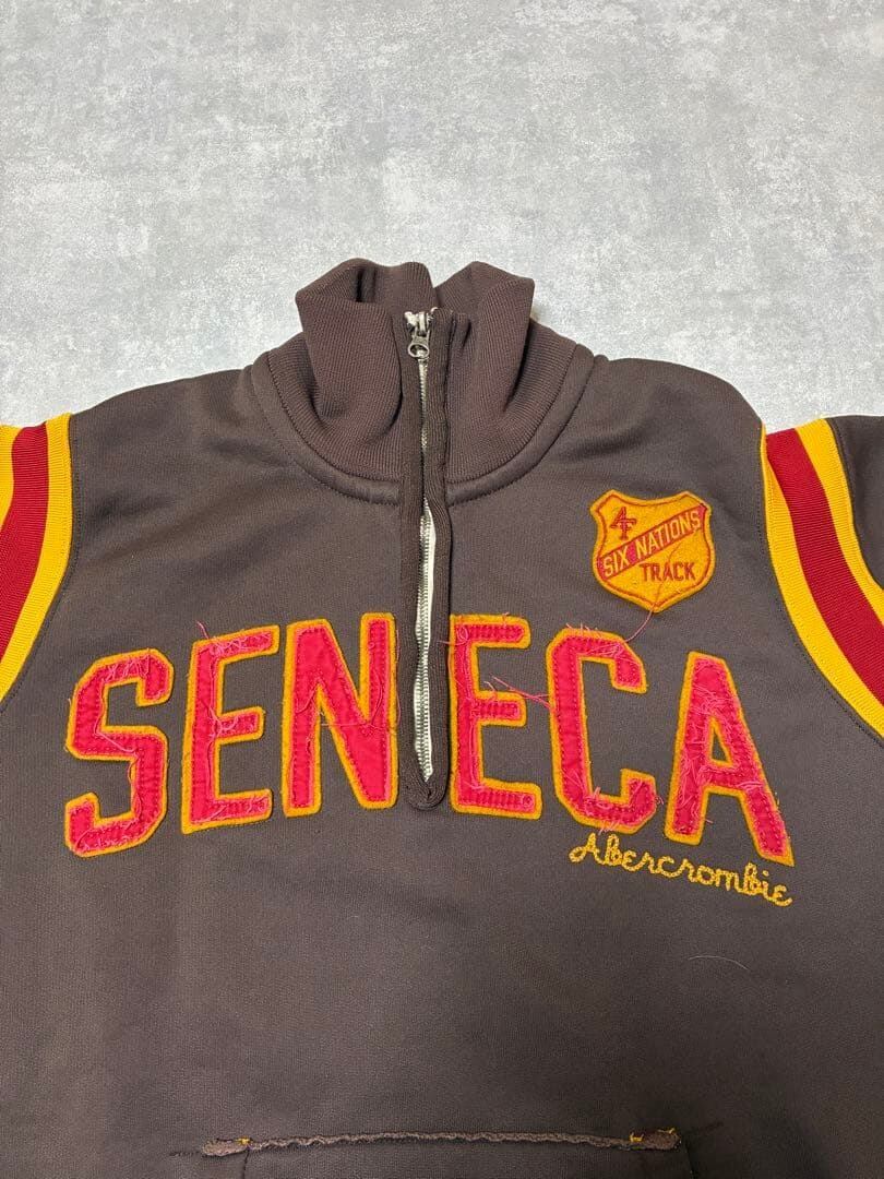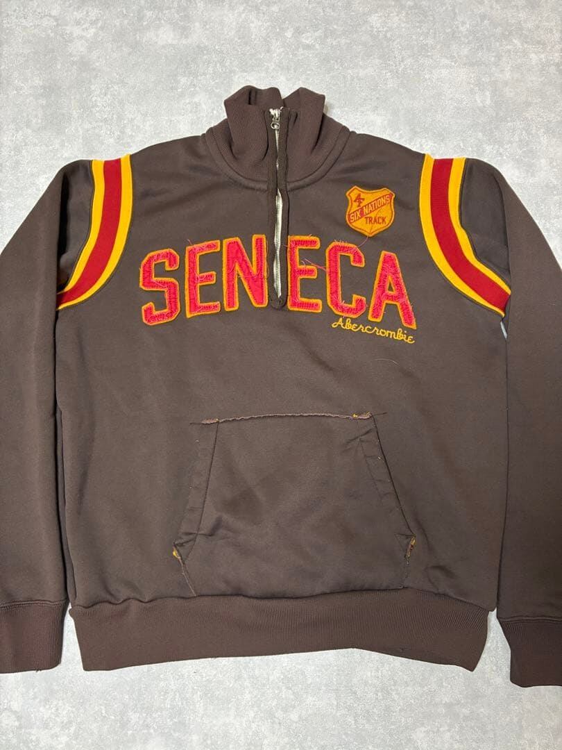 フロントには大きく配置された「SENECA」や刺繍ロゴ、「Six Nations Track」のワッペンが付いた、アメリカン・カレッジの陸上チームを思わせるアイテム。