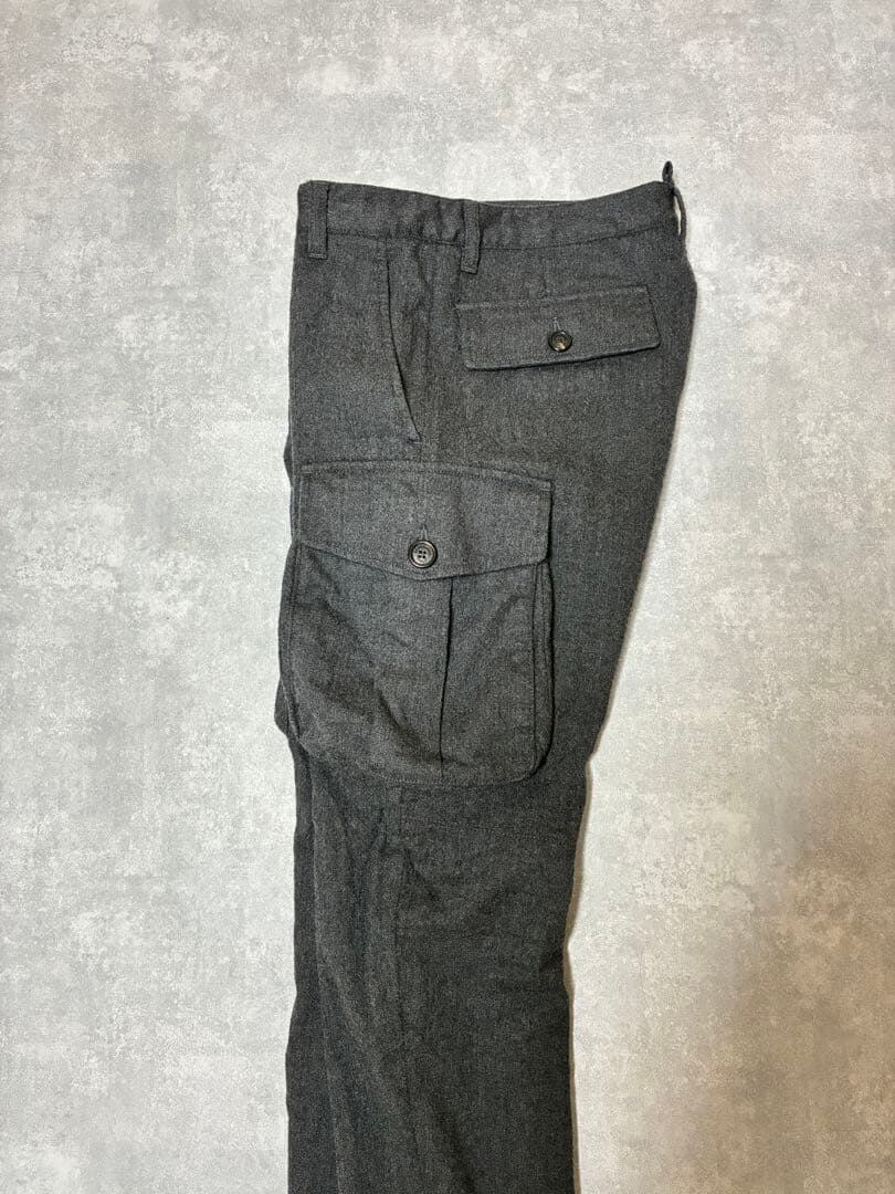 上品なチャコールグレーのウール素材に実用性の高いフラップ付きカーゴポケットを組み合わせた武骨さと洗練を両立した一本です。