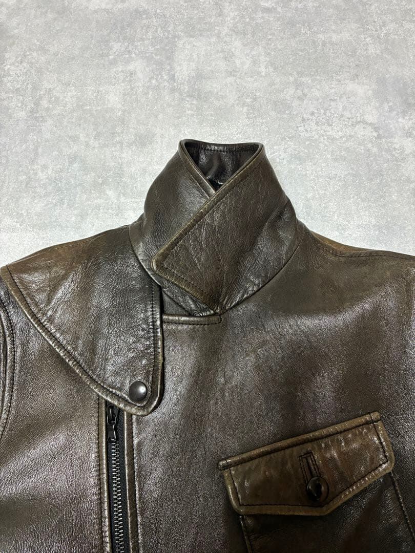 ビンテージのモーターサイクルアイテムに見られる斜め配置されたマップポケットや首元のガンフラップ的なデザインが特徴です。