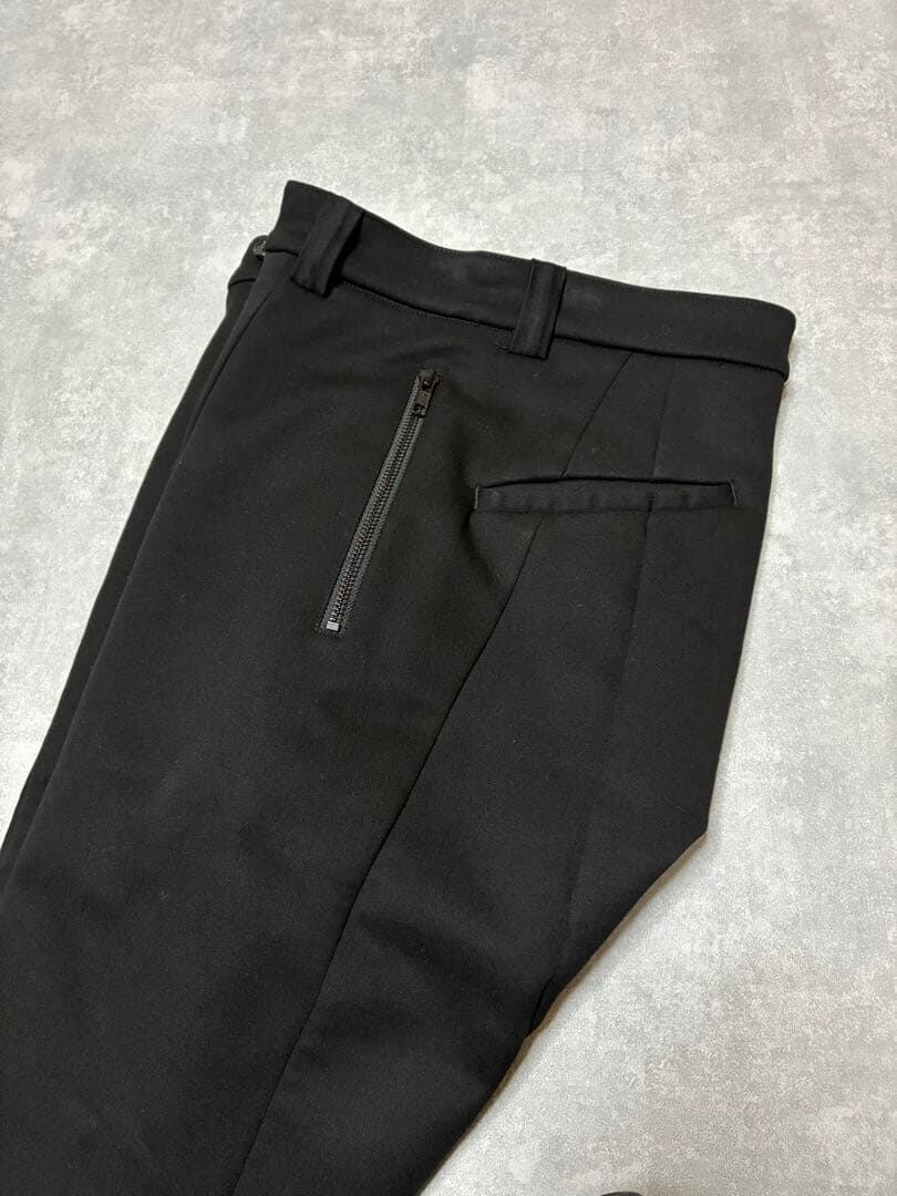 通常、ボンバーヒート系の素材で細身パンツを作ると伸縮性によってタイツのようなタイトな見え方になりがちですが、本作は外側を高密度生地に切り替えることでモードなシルエットと立体感をしっかりキープし、機能性も兼ね備えることに成功しています。