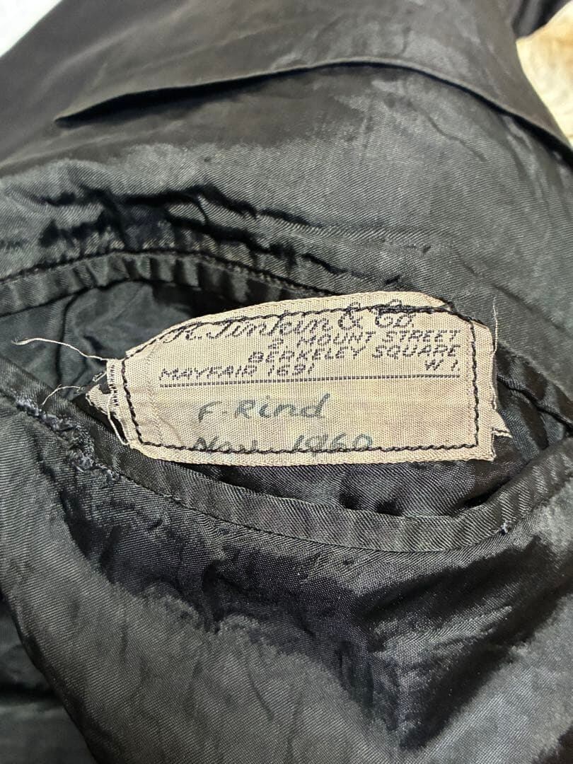 内タグには「1960年11月」や「F. Rind」という人名の記載があり、当時実際にオーダーで仕立てられた一点物であることが分かる、背景まで魅力のあるヴィンテージピースです。