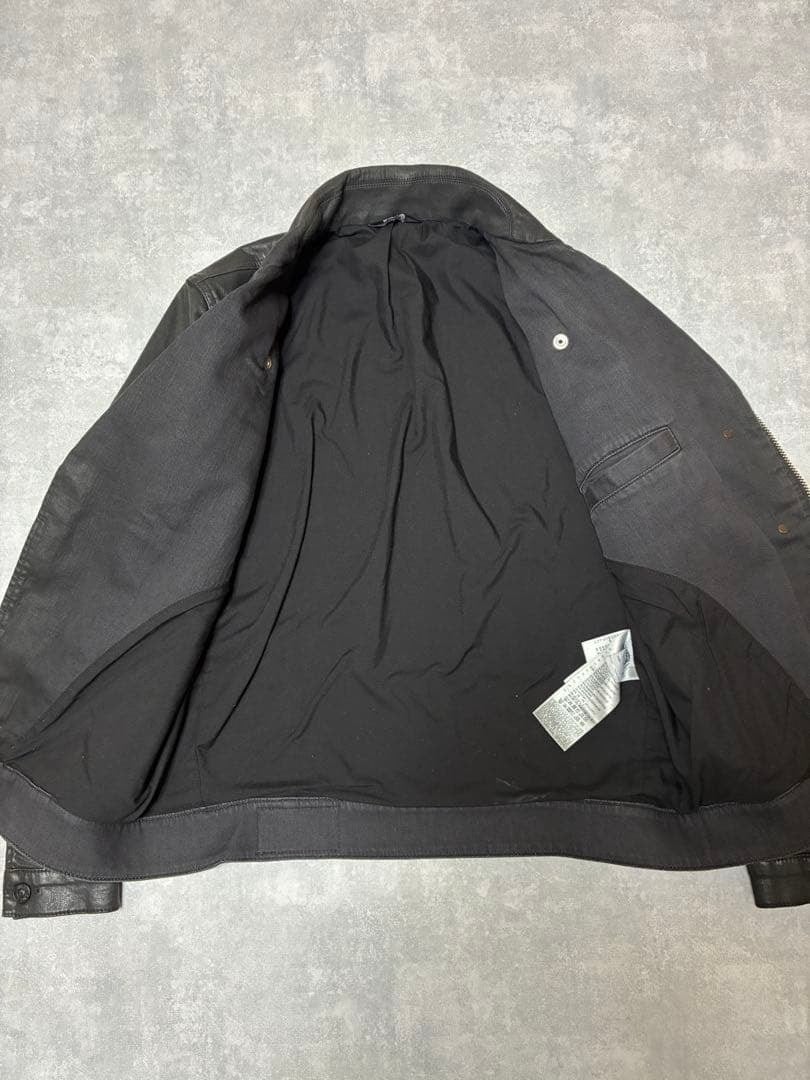 ベースはデニムジャケットの構造で作られており、そこにダブルライダースのフロントデザインをドッキングさせた大胆な切り替えが特徴です。