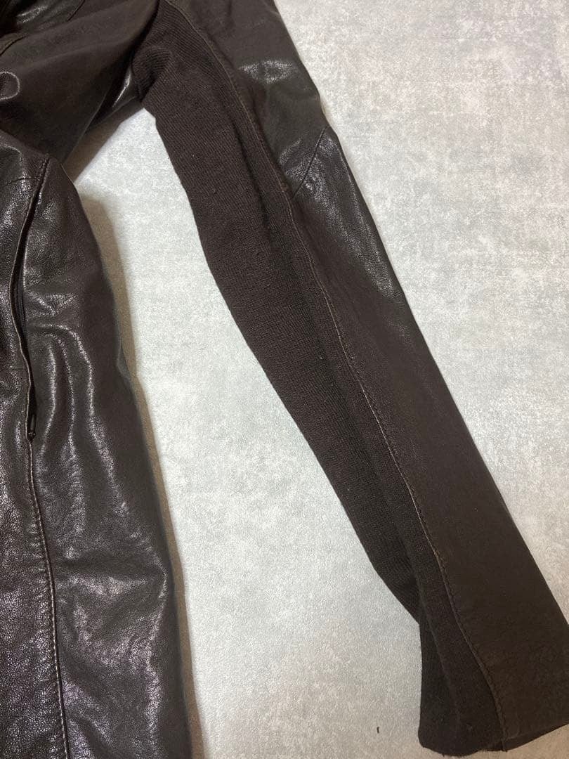 また、袖内側にはニットリブの切り替えが施されており、可動性とフィット感を高めた作りも魅力です。レザーの無機質な質感に対して、異素材切り替えがさりげないアクセントとなっています。