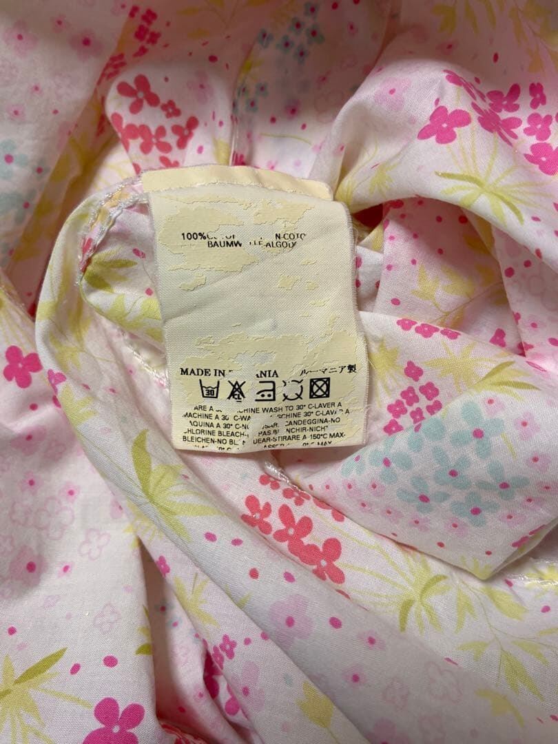 ホワイトベースの生地にピンクや赤、淡いブルーの小花柄を散りばめた華やかなフラワープリントが特徴のアイテム。