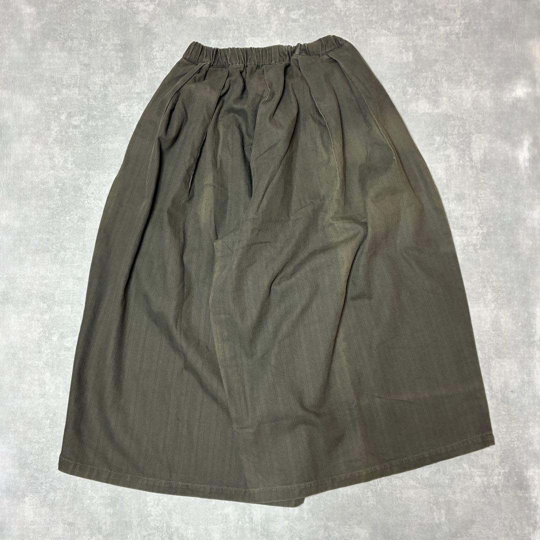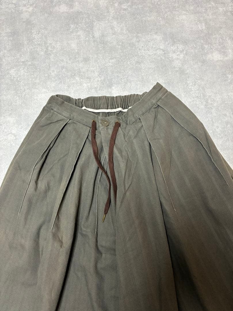 フロントには左右非対称の大きなタックが入り、腰まわりから裾にかけてゆったりと広がるシルエットが特徴です。